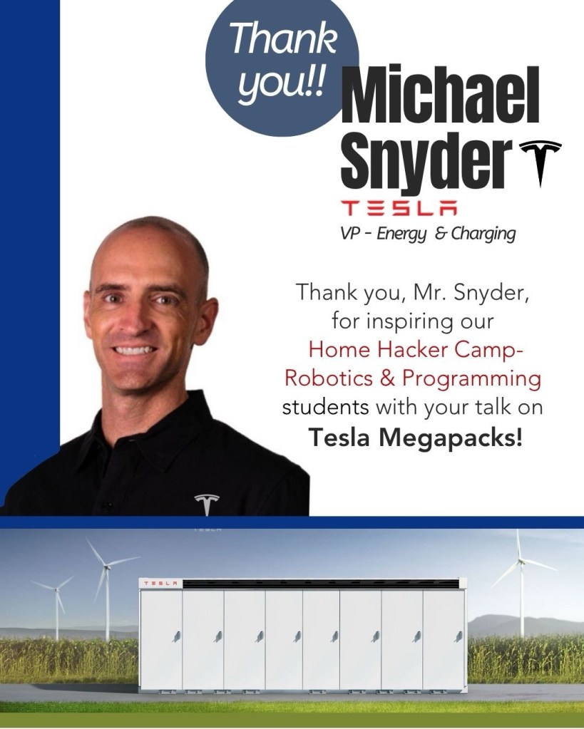 Mr. Snyder gave an insightful and inspiring talk about how Tesla Megapacks are used to stabilize power distbrution in rural and large cities throughout the world. This engaging conversation with our Home Hacker Camp – online robotics & programming students opened eyes to an empowering technology.